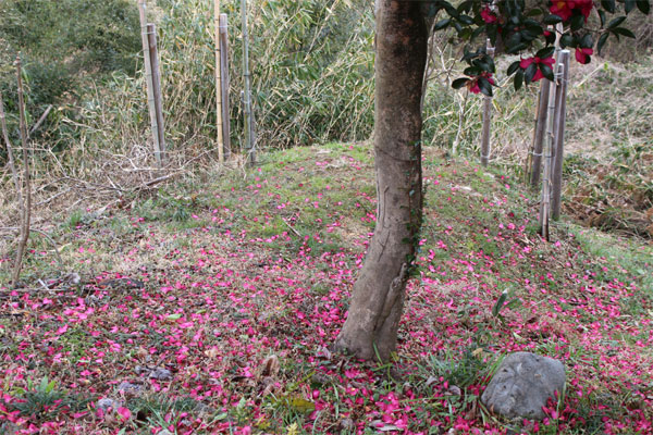 たかしさんの散歩道。きれいなさざんかの敷物ができていますね。