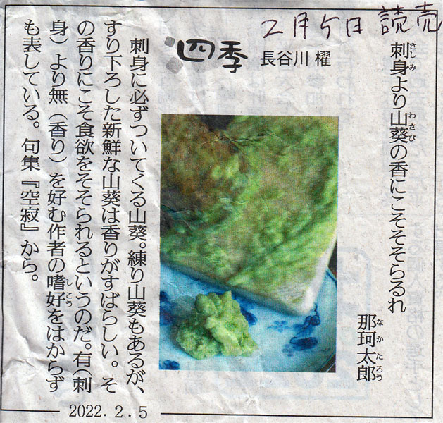 この俳句の場合、山葵の香は見えないけれども、はっきりと五感に