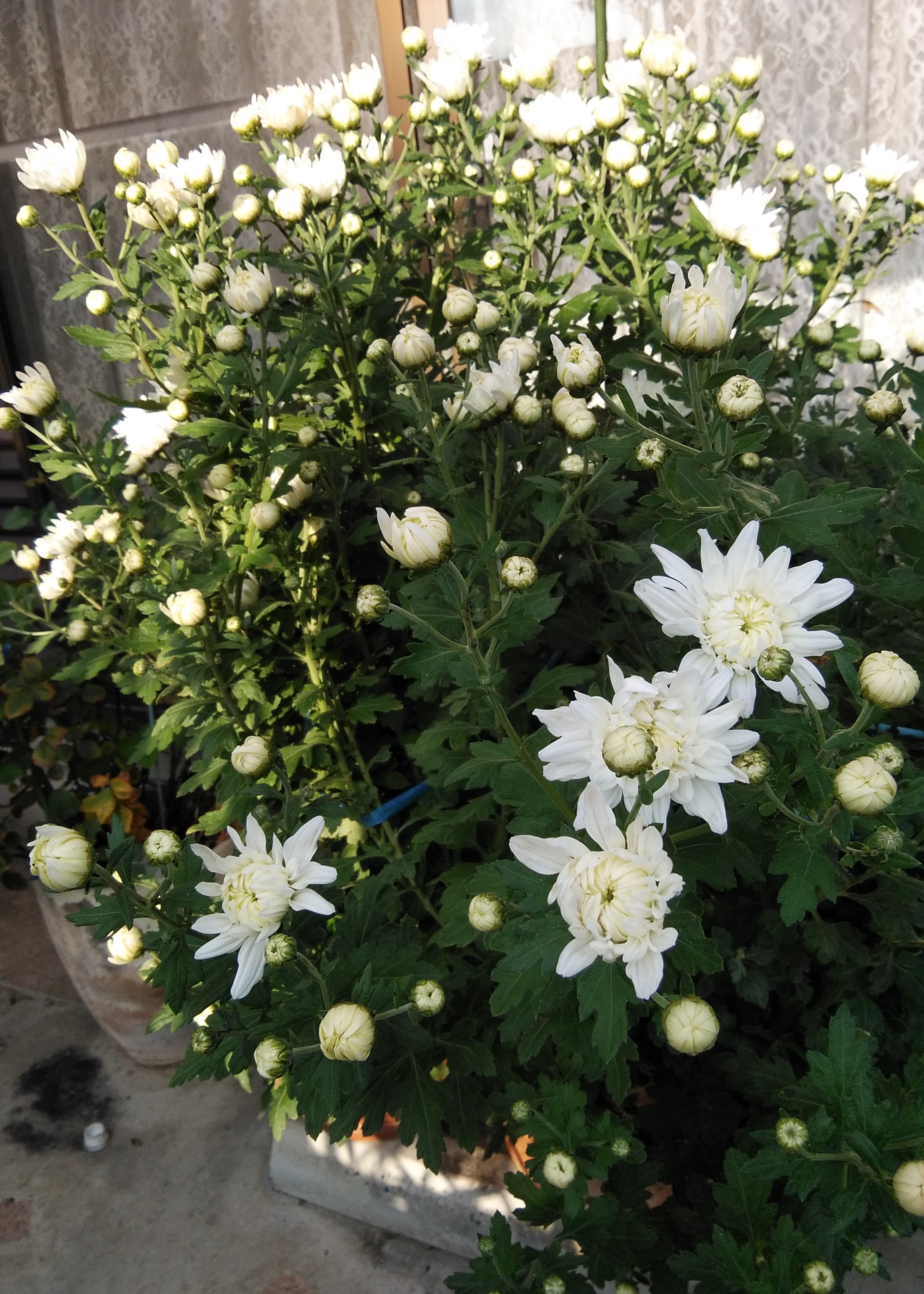 3月末に狂犬病予防接種をしてもらうため動物病院へ行きました。その時獣医さんが菊がきれいに咲いていましてねと言ってくれたのです。4〜5年前鉢に小菊を3株植えました。そのうち1株だけが毎年芽をだし花を咲かせます。それが外を通る人に見えるのですが、獣医さんがそれを見てくれていたのです。また今年も咲かせてくださいと言われました。買った株は小菊だったのに、次の年から芽が出た株は小菊ではなくなっていました。
