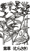 葉に租毛が多い。夏、上方の葉腋に数花をつける。花冠は白色、縦六mm内外、五裂する。根は紫根と呼ばれ、 かわくと紫色となり、古来染料(シコニン)とされた。」(挿入図は、牧野新日本植物図鑑より「むらさき」)